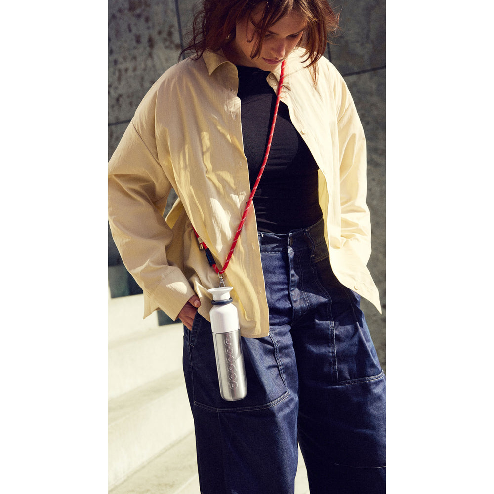 La Dopper Cord vous permet de garder votre gourde toujours à portée de main. Portée en bandoulière, elle libère vos poches et vous accompagne au quotidien, en ville comme en déplacement.